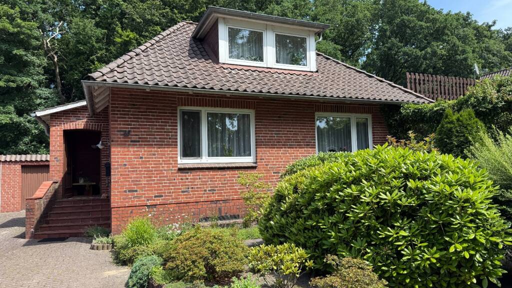 Dieses massiv erbaute Einfamilienhaus aus dem Jahr ca. 1960 mit Anbau von ca. 1969 bietet auf einer Wohnfläche von ca. 120 m² ein durchdachtes Raumkonzept. Im Erdgeschoss befinden sich neben der Diele ein Wannenbad, eine Küche, ein Schlafzimmer sowie ein geräumiges Wohn-/ Esszimmer. Durch schließen einer Wand im Wohn-/ Essbereich kann bei Bedarf unkompliziert ein weiteres Zimmer entstehen - ideal also für Familien oder Paare. Das Dachgeschoss hält ein WC und zwei "halbe" Zimmer (je ca. 8 m²) bereit. Das Haus befindet sich auf einem großzügigen Grundstück mit ca. 641 m² Fläche und grenzt unmittelbar an ein idyllisches Waldstück - ein perfekter Ort für Naturliebhaber und Ruhesuchende. Der gepflegte Rotklinkerbau ist teilunterkellert, hat eine klassische Architektur mit Walmdach und einem begehbaren Flachdach über dem Anbau. Eine schöne Terrasse sowie ein gepflegter Garten bieten viel Raum zur Entspannung im Freien. Eine Garage rundet das Angebot ab.