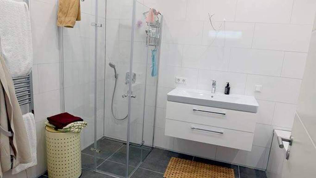 Das Badezimmer ist über ein Dachfenster gut belichtet. Neben einer Badewanne finden Sie eine Dusche, ein Hänge-WC und ein Waschbecken.