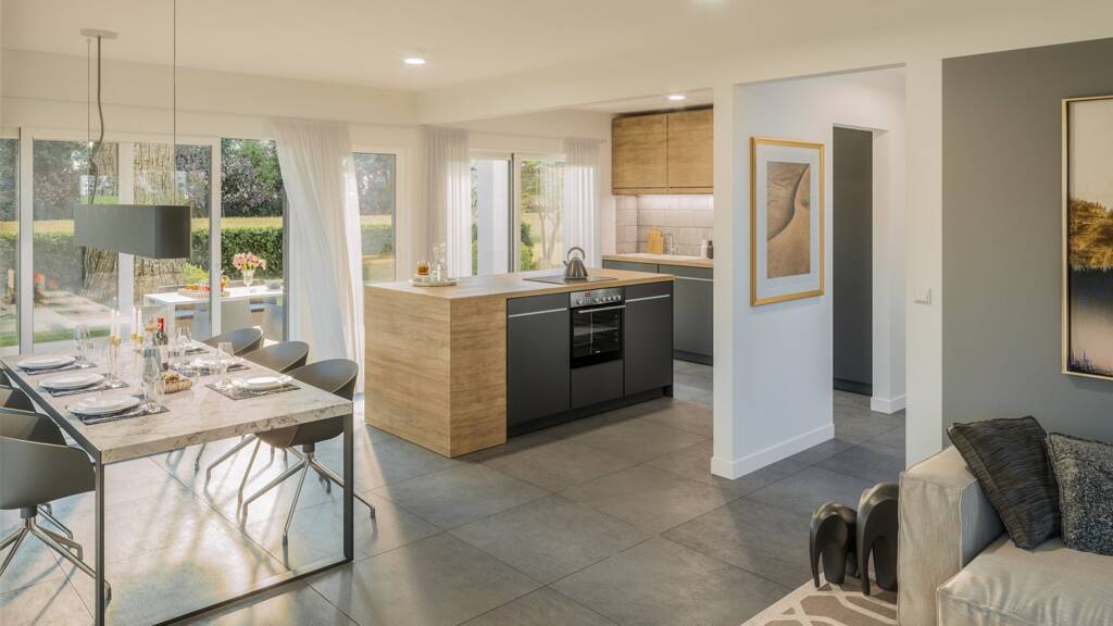 Das durchdachte Raumkonzept fördert nicht nur das Miteinander, sondern auch die Privatsphäre. Der offene Wohn- und Essbereich lädt zum gemeinsamen Verweilen ein und bietet gleichzeitig direkten Zugang zur Terrasse, die zum Entspannen im Freien einlädt. Die Schlafzimmer sind großzügig geschnitten und bieten ausreichend Platz für individuelle Einrichtungsideen. So entsteht eine harmonische Verbindung zwischen Rückzug und Gemeinschaft, die das Leben in diesem Haus besonders lebenswert macht.