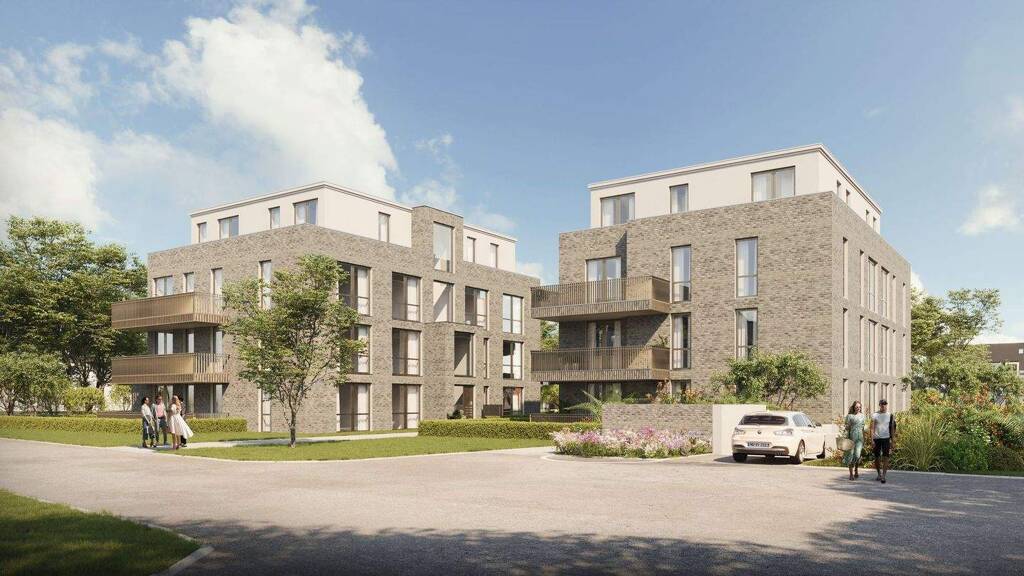 Das Gebäudeensemble bestehend aus zwei Neubau-Mehrfamilienhäusern mit insgesamt 15 barrierefreien Eigentumswohnungen und Tiefgarage.