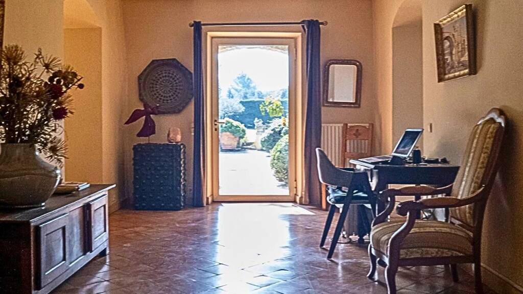The property has equestrian facilities, including stables, a paddock and a field of olive trees that underline the authenticity of the setting.