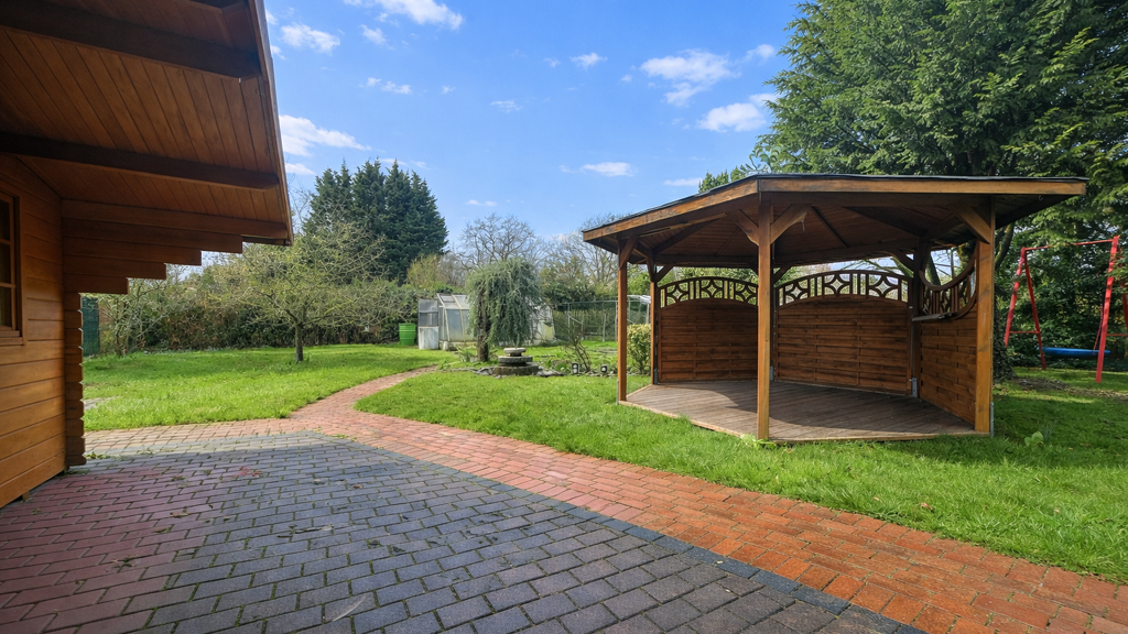 Das großzügige Grundstück mit ca. 753 m² bietet viel Raum für Garten, Freizeit und individuelle Gestaltungsmöglichkeiten. Ein Gewächshaus, eine gemütliche Blockhütte, ein Pavillon sowie ein gewachsener Apfelbaum verleihen dem Garten einen besonderen Charme und machen ihn zu einem idealen Rückzugsort für Natur- und Gartenliebhaber.