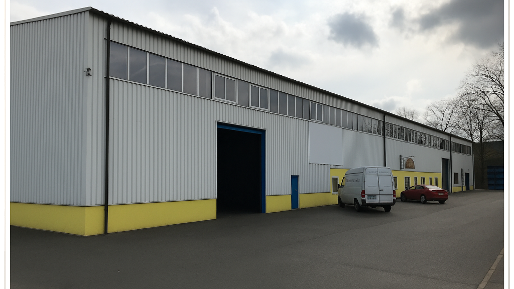 Lagerhalle mit Büro in Stahlbeton-Skelettauweise. Fassaden und Dach aus Trapezblech mit ca. 10 cm. Wärmeisolierung. Industriefußboden mit geschliffenem Estrich. Die Lagerfläche hat ca. 408 m² und die Bürofläche ca. 234 m². Hallenhöhe 7.20 m bis 9,5 m. Energieausweis liegt noch nicht vor. In Bearbeitung.