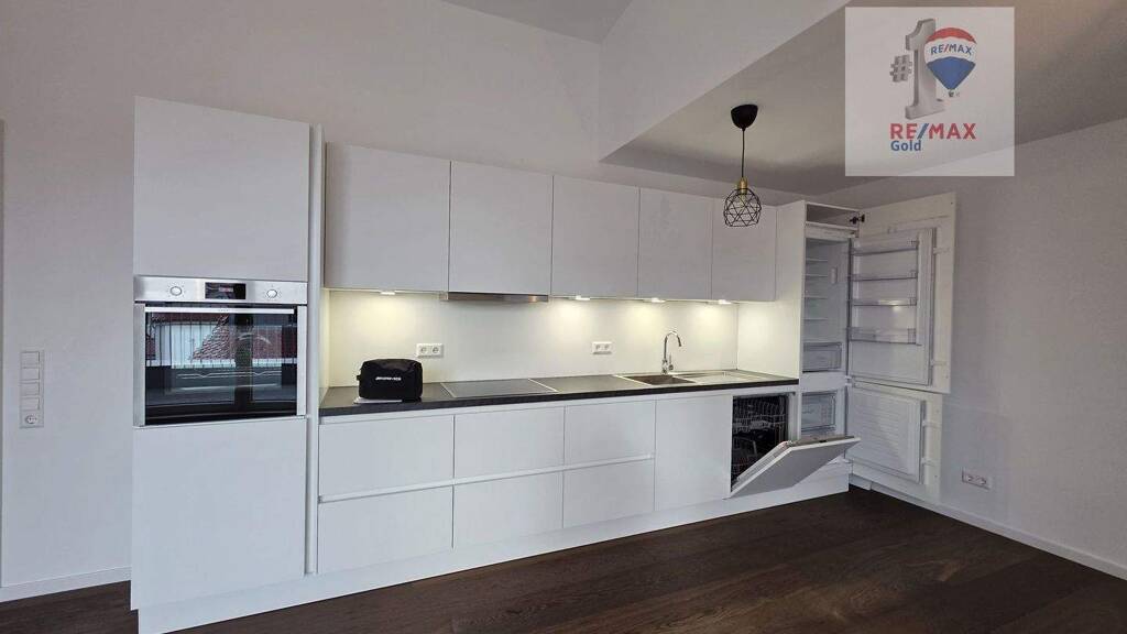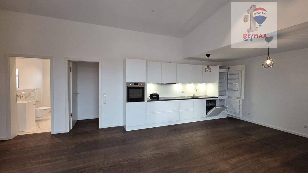 Im Inneren überzeugt die Wohnung durch ihre hochwertige Ausstattung: Ein edler Parkettboden sorgt für eine warme Wohnatmosphäre. Das modern gestaltete Badezimmer bietet eine begehbare Dusche mit Regenschauer-Duschkopf sowie einen Waschmaschinenanschluss. Die moderne Einbauküche ist mit Cerankochfeld, Backofen, Kühlschrank und Spülmaschine vollständig ausgestattet und fügt sich harmonisch in den Wohnraum ein.