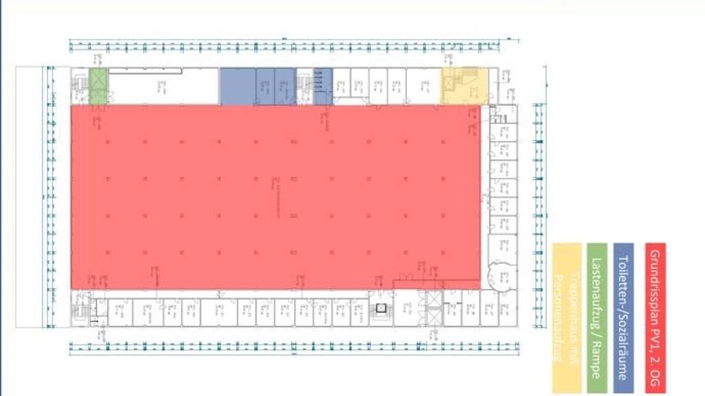 + Blocklagerung bis zu 4 m Höhe + Rampe + Lastenaufzug + Aufteilung: Lagerhalle, Nebenräume: Toiletten und Sozialräume