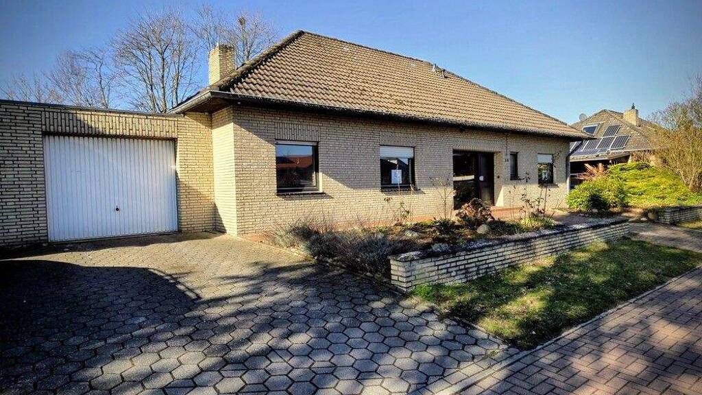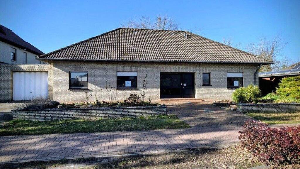 Dieser im Jahr 1979 erbaute Bungalow überzeugt durch seine durchdachte Raumaufteilung und ebenerdiges Wohnen in familienfreundlicher Umgebung. Das Haus bietet ideale Voraussetzungen für Paare, Familien oder auch für das komfortable Wohnen im Alter. Der gut geschnittene Grundriss sorgt für kurze Wege und eine klare Raumstruktur. Das großzügige Wohnzimmer bildet das Herzstück des Hauses und bietet direkten Zugang zur überdachten Terrasse. Auch das Elternschlafzimmer verfügt über einen eigenen Zugang zur Terrasse und schafft damit eine besonders angenehme Verbindung zwischen Innen- und Außenbereich. Zwei weitere Zimmer bieten flexible Nutzungsmöglichkeiten als Kinder-, Gäste- oder Arbeitszimmer. Die separate Küche ist funktional geschnitten und bietet ausreichend Platz für eine moderne Einbauküche. Ergänzt wird das Raumangebot durch einen praktischen Hauswirtschaftsraum (HWR), der zusätzlichen Stauraum und Platz für Waschmaschine und Trockner bietet. Das große Badezimmer verfügt über eine Dusche, Wanne, zwei Waschbecken, ein BD und ein WC, während ein separates Gäste-WC zusätzlichen Wohnkomfort bietet. Der eingezäunte Garten lädt zum Verweilen, Spielen oder Gärtnern ein und bietet Privatsphäre für die ganze Familie. Die überdachte, westlich ausgerichtete Terrasse erweitert den Wohnraum ins Freie und schafft einen geschützten Bereich für gemütliche Abende - unabhängig vom Wetter. Abgerundet wird dieses Angebot durch eine Einzelgarage, die sicheren Stellplatz für Ihr Fahrzeug sowie weiteren Stauraum bietet. Die Immobilie wird über ein Bieterverfahren verkauft. Das Mindestgebot liegt bei 280.000 Euro. Näheres erfahren Sie nach Kontaktaufnahme. Der Energieausweis ist in Arbeit!