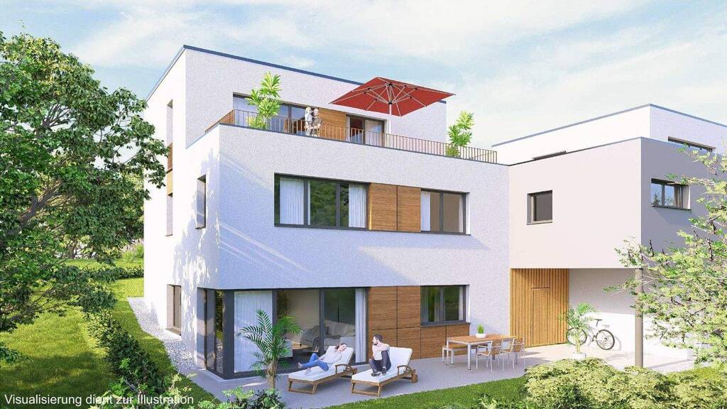 Das Raumkonzept umfasst vier flexibel nutzbare Zimmer, einen separaten Elternbereich mit Ankleide und Bad en suite, eine südlich ausgerichtete Dachterrasse, mehrere Nebenräume sowie eine Garage für zwei Fahrzeuge zzgl. Außenstellplatz.