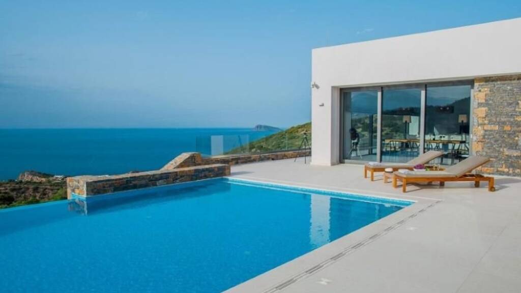 Diese Villa ist ein Luxusjuwel, das die Bucht über der Stadt Agios Nikolaos und den Berg Sitia am Stadtrand von Istron, Kalo Chorio, am Hang überblickt.