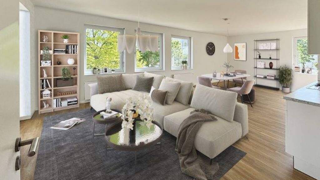 Wohnkomfort auf höchstem Niveau . Lichtdurchflutete Räume durch große Fensterfronten . Offener Wohn- und Essbereich für geselliges Beisammensein . Moderne Einbauküche mit funktionaler Ausstattung . Gemütliches Schlafzimmer für erholsame Nächte . Zeitgemäß ausgestattetes Badezimmer Ihr privater Rückzugsort . Sonniger Balkon mit Blick ins Grüne . Perfekt für entspannte Stunden im Freien . Idealer Platz für Frühstück oder Feierabend-Drink
