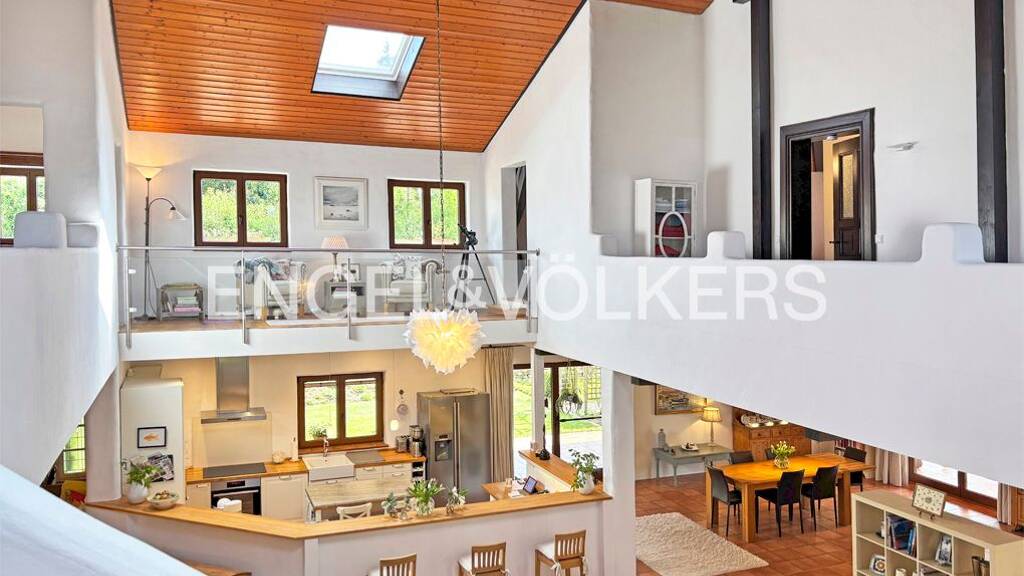 Im Jahre 2006 wurde diese schöne Landhausvilla in Massivbauweise auf einem ca. 4.000 m² großen Grundstück errichtet. Die Immobilie besticht durch einen großen, offenen Bereich im Erdgeschoss; dort sind Wohn- und Esszimmer, ein Wintergarten und eine Landhausküche mit Esstresen untergebracht. Ein weiteres Highlight ist die umlaufende Galerie im Obergeschoss. Die Immobilie liegt eingebettet auf einem großflächigen Parkgrundstück mit zahlreichen Rückzugsmöglichkeiten. Neben einem großen Schwimmteich findet sich im rückwärtigen Bereich auch eine Streuobstwiese. Zum Angebot gehört außerdem eine Waldfläche mit ca. 900 m².