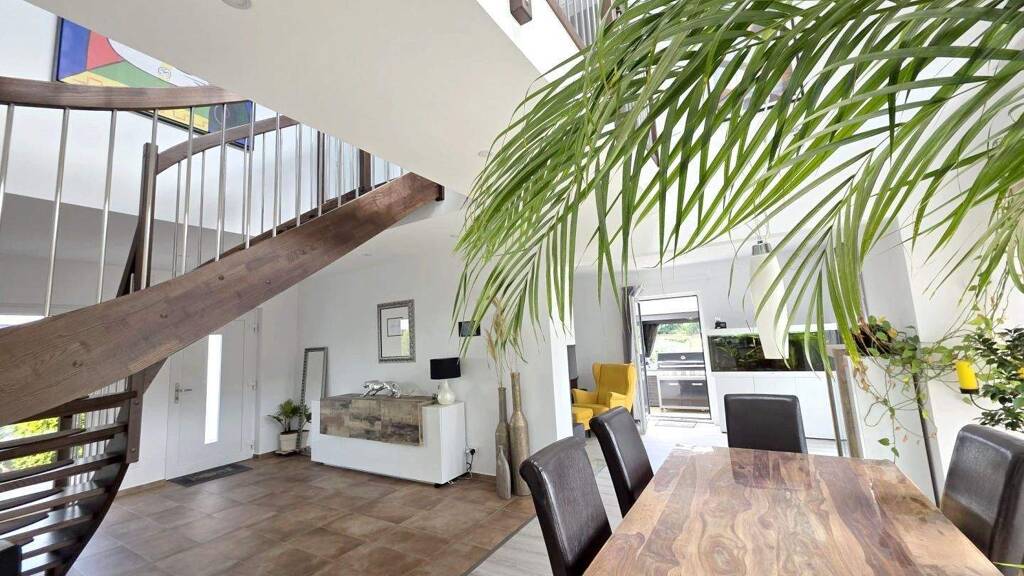 Über eine elegant gestaltete Treppe gelangt man in das Obergeschoss, das durch einen besonderen architektonischen Blickfang besticht: