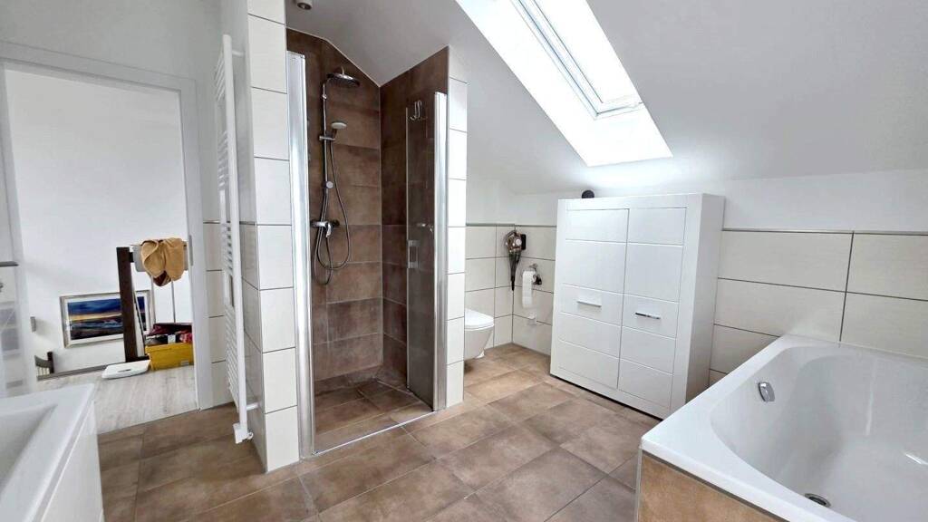 Das Obergeschoss bietet ein Elternschlafzimmer mit separatem Ankleidezimmer, ein Kinderzimmer, ein Büro, von dem aus ein weiteres Zimmer zugänglich ist. Ideal als Akten-, Gäste- oder Hobbyzimmer, ein modernes Badezimmer mit Dusche und Badewanne, dass das Raumangebot perfekt abrundet.