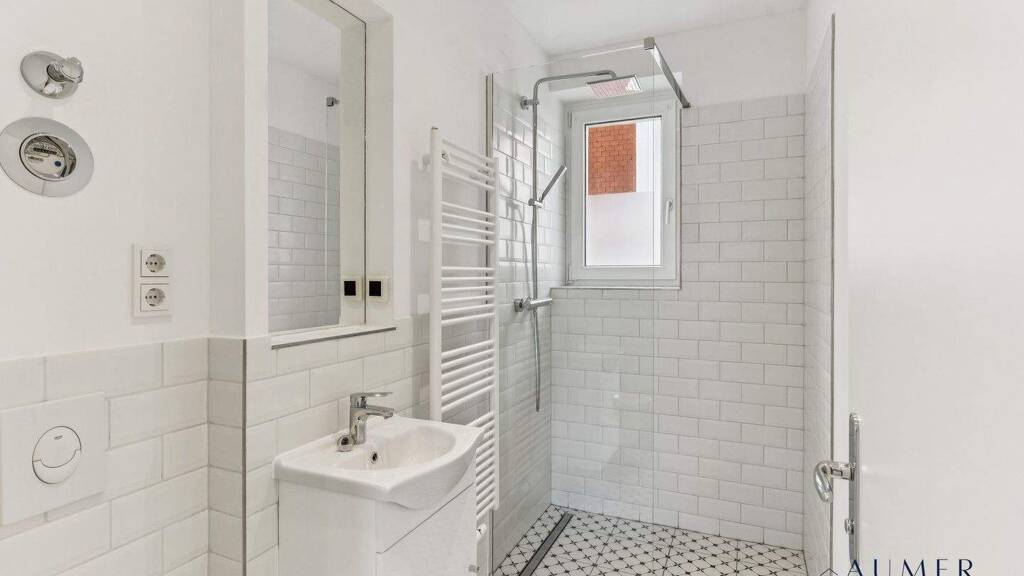 Das Tageslichtbad ist modern gestaltet und funktional ausgestattet. Weiße Wandfliesen im Metro-Stil, ein Fliesenboden mit dezentem Muster sowie eine bodengleiche Glasdusche mit Regenduschkopf sorgen für eine zeitgemäße Optik. Der Waschtisch und die Armaturen sind schlicht und passend zum Gesamtkonzept gewählt.