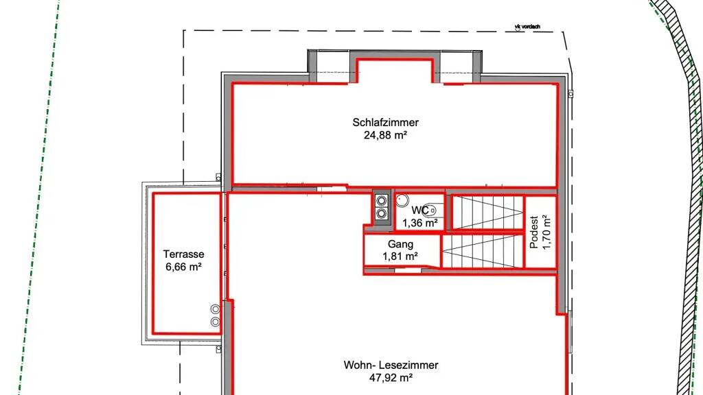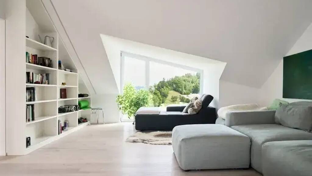 Im Dachgeschoss befindet sich der weitläufige Wohnbereich mit großzügiger Raumhöhe. Angrenzend liegt das Schlafzimmer mit zwei begehbaren Kleiderschränken auf beiden Seiten des Bettes. Auch auf dieser Ebene steht ein separates WC zur Verfügung. Die Terrasse bietet einen schönen Ausblick und zusätzlichen Freiraum.