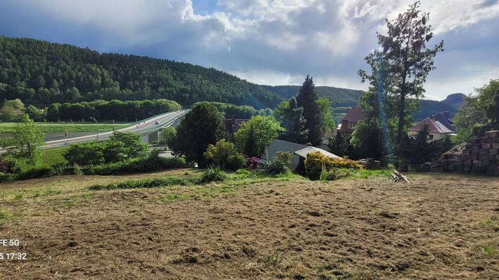 Das Baugrundstück ist ein für die Sächsische Schweiz typisches Hanggrundstück am Waldrand mit unverbaubarem Blick zum Felsen Lilienstein und über die Elbe zur gegenüber-liegenden Hangseite. Der Hang in Süd-Süd-West-Ausrichtung wird lange von der Sonne beschienen. Das Grundstück wird bauträgerfrei verkauft. Der Stromanschluss ist gegeben. Schmutz- und Regenwasseranschlüsse liegen im Grundstück; die alten Schächte sind freizulegen. Der Telekomanschluss ist zu reaktivieren. Trinkwasser- und Gasleitung liegen in der Straße vor dem Grundstück und können ins Grundstück geführt werden. Für das Grundstück liegt ein Bauvorbescheid für 2 Baukörper vor. Im Bauvorbescheid wurde der untere der beiden Baukörper so angeordnet, dass die Wohnebenen selbst von einem Extrem-Hochwasser nicht betroffen wären, obwohl der unterste Grundstücksteil als Überschwemmungsgebiet kartiert ist.