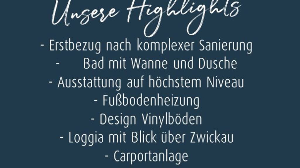Erweiterte Ausstattungsmerkmale: - Erstbezug nach komplexer Sanierung - barrierefrei und schwellenlos - Ausstattung auf höchstem Niveau - Fußbodenheizung - Außenjalousie - bodentiefe Fenster und LED-Downlights - Design Vinylböden - überdachte Loggia und Blick über Zwickau - bei Bedarf behindertengerechte Ausstattung - Aufzug - Carportanlage - externes Fahrradparksystem - neu gestaltetes Wohnumfeld mit Wohlfühloase zzgl. Genossenschaftsanteile