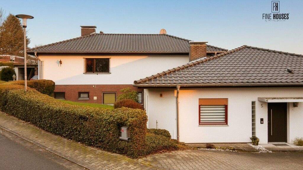 Dieses gepflegte Hebel-Einfamilienhaus aus dem Jahr 1974 bietet dank des 1981 errichteten Anbaus vielfältige Nutzungsmöglichkeiten. Die beiden Gebäudeteile verfügen über getrennte Eingänge, sodass sie unabhängig voneinander genutzt werden können. Eine direkte Verbindung zwischen Haupthaus und Anbau besteht nicht.