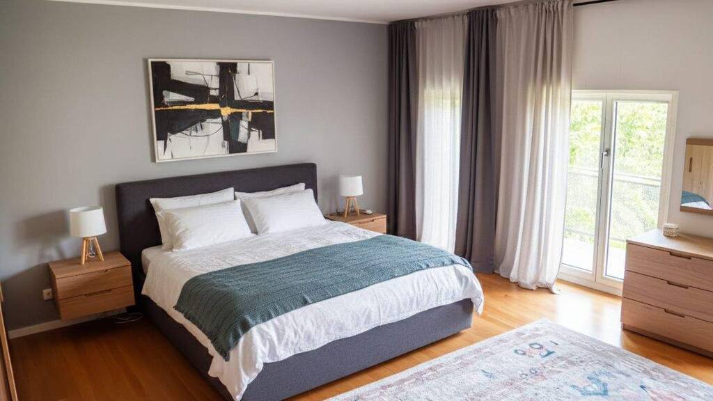 Das großzügige Schlafzimmer bietet ausreichend Platz für Ruhe und Erholung. Das moderne Badezimmer ist mit einer Badewanne ausgestattet und bietet zudem einen praktischen Anschluss für Waschmaschine und Trockner.