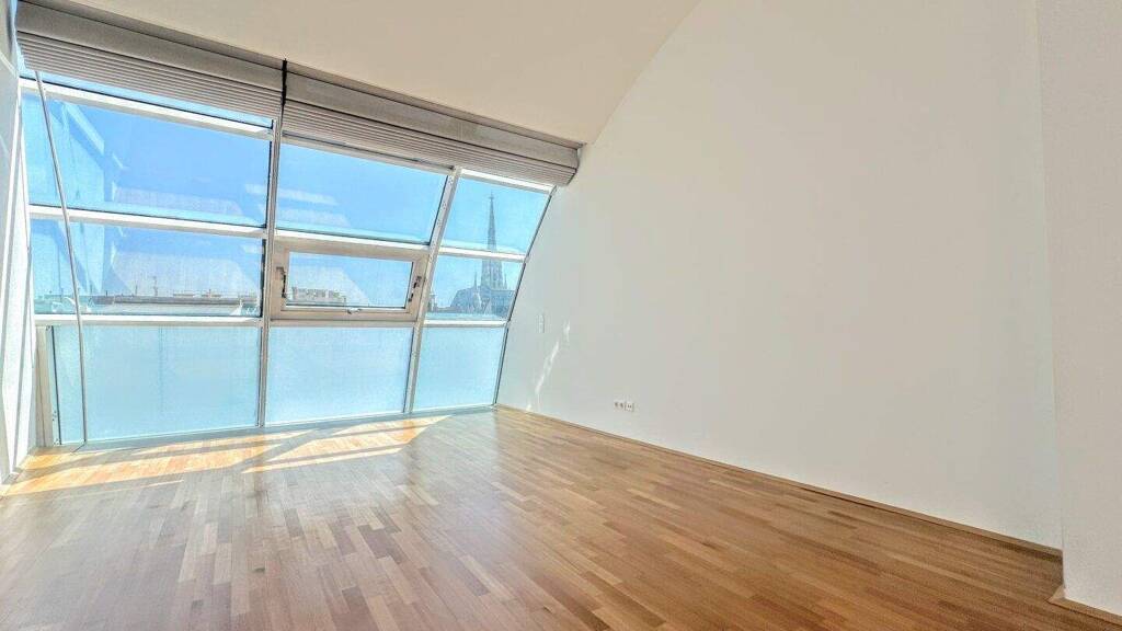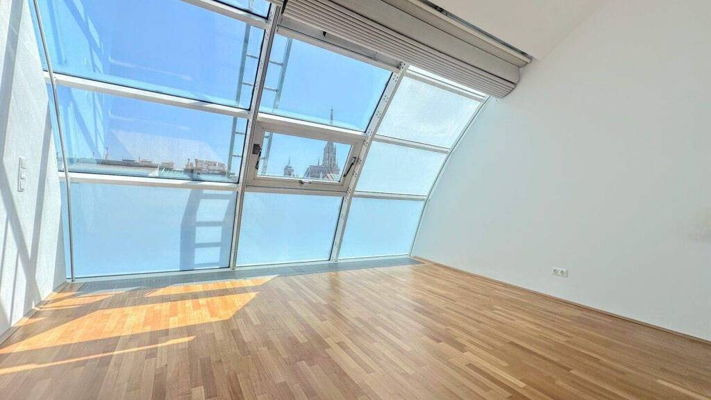 Die Wohnung erstreckt sich über das 6. und 7. Obergeschoss und besticht durch eine beeindruckende Glasfront, deren geschwungene Linien der Wohnung eine unverwechselbare architektonische Note verleihen. Diese Front bietet nicht nur ein großzügiges Raumgefühl und viel Tageslicht, sondern auch einen Blick auf den Stephansdom.