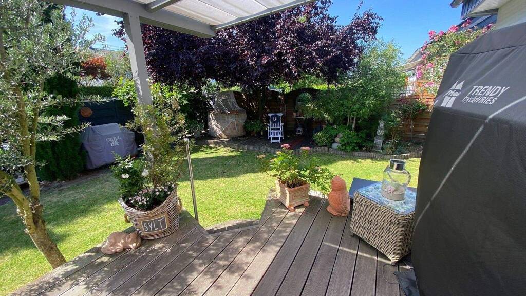 Der liebevoll angelegte Garten lädt zum Entspannen, Gärtnern und Verweilen ein. Die großzügige Terrasse mit Glas-Überdachung bietet einen geschützten Bereich für gesellige Stunden im Freien - unabhängig von der Wetterlage.