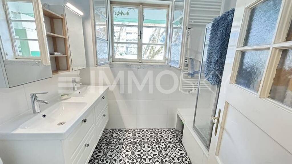 Im Jahr 2020 wurden bereits wesentliche Modernisierungsmaßnahmen umgesetzt, um den historischen Charakter der Wohnung mit den Anforderungen modernen Wohnens zu verbinden. Das geschmackvoll modernisierte Badezimmer überzeugt durch seine elegante Gestaltung und hochwertige Funktionalität. Es verfügt über einen Doppelwaschtisch, eine Badewanne sowie einen Waschmaschinenanschluss und fügt sich harmonisch in das hochwertige Gesamtbild der Wohnung ein. Der rund 6 m² große Balkon erweitert den Wohnraum ins Freie und schafft einen angenehmen Rückzugsort für entspannte Momente mitten in der Stadt.