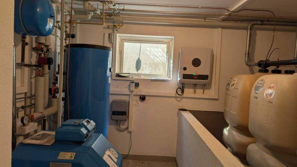UNTERGESCHOSS bzw. Souterrainbereich Das im Souterrainbereich befindliche, nach Südwesten ausgerichtete helle 1-Zimmer-Appartement (Einliegerwohnung) ist über eine Außentreppe und die vorgelagerte, überdachte Terrasse vom EG-Eingangsbereich aus erreichbar. Zusätzlich gelangen Sie über das Treppenhaus im EG in den UG-Flur, in den Hauswirtschaftsraum mit Dusche, Waschbecken, WC und WM/Trockner sowie in den Saunaraum mit Saunakabine. Weiters kommen Sie in den Heizraum mit Öllager (3x1500 Liter Tanks) und Wechselrichter für die Photovoltaikanlage: