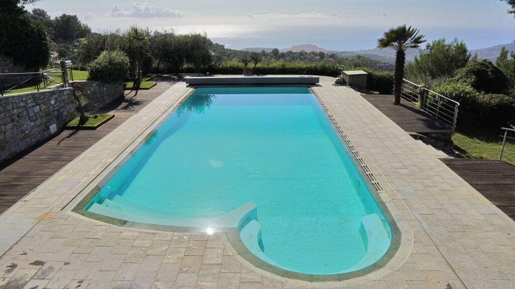 Ein weitläufiger Garten mit Panoramaterrassen, mediterraner Vegetation, gepflegten Rasenflächen und einem angrenzenden Wald umgibt die zum Verkauf stehende Villa und schafft eine einladende und ruhige Atmosphäre. Die Villa ist mit einem privaten Swimmingpool ausgestattet, der von einem großen Liegebereich umgeben ist und einen spektakulären Meerblick bietet. Eine Sommerküche bereichert das Anwesen.