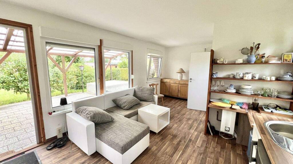 Der Bungalow überzeugt mit Laminat- und Fliesenböden, einem Tageslichtbad mit Dusche sowie zweifach verglasten Fenstern und Rollläden. 2018 wurden Systembauwände eingesetzt, Dämmung erneuert und Grundriss wie auch Leitungen modernisiert. Die Bodenplatte wurde 2022 erneuert, Wasser- und Elektroinstallationen 2023.