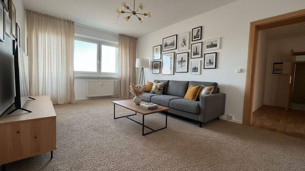 Die Wohnung überzeugt mit einer durchdachten Raumaufteilung und einer Vielfalt an Bodenbelägen. Die Wohnbereiche sind mit stilvollem Laminat und warmem Teppichboden ausgestattet, während die Küche und das Badezimmer über pflegeleichte Fliesen verfügen.