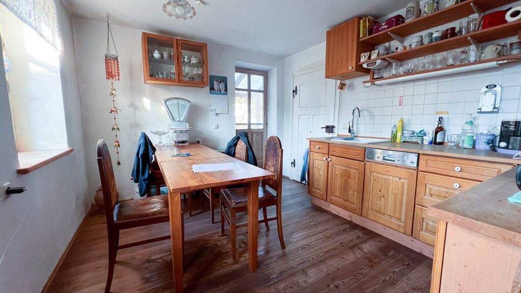 Bei der umfassenden Renovierung wurde besonderer Wert darauf gelegt, den charakteristischen Charme des Hauses zu bewahren. Die Zimmertüren wurden fachgerecht restauriert, und die neuen Holzfußböden aus Fichte und Lärche harmonieren perfekt mit den erhaltenen, bestehenden Fußböden. Der Außenputz wurde mit einem Dreischichtputz und Naturfarbe erneuert, während die Fenster durch stilvolle neue Holzsprossenfenster mit passenden Holzfensterbänken ersetzt wurden.