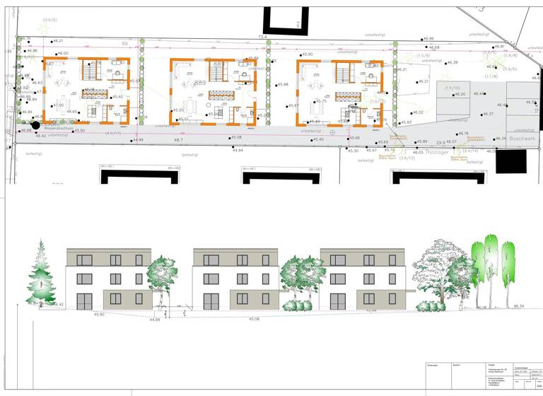 Die hintere Grundstücksfläche kann flexibel genutzt werden, entweder für Parkplätze, wie die jetzige Planung es hergibt oder als begrünte Gartenfläche. Ein Einzelverkauf der Häuser ist nicht möglich.