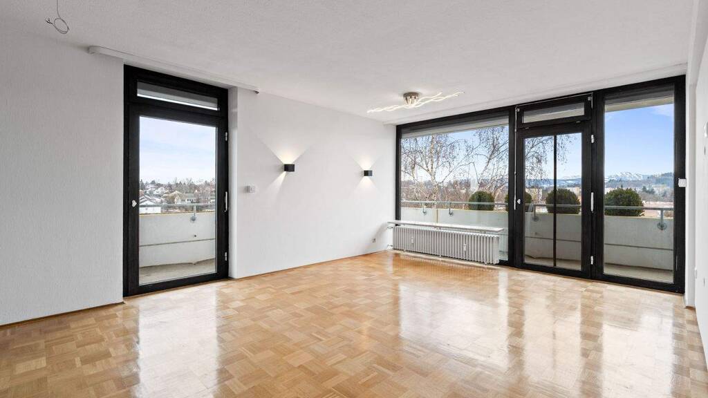 Die Küche ist mit einer modernen Küchenzeile ausgestattet. Das großzügige Wohn- und Esszimmer bildet das Herzstück der Wohnung und gewährt über zwei Balkontüren Zugang zum weitläufigen Eckbalkon in Süd-Ost-Ausrichtung mit beeindruckendem Bergblick auf die Allgäuer Voralpen.