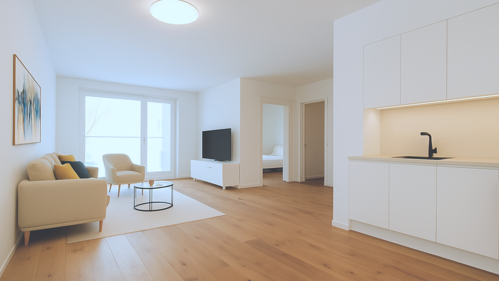 Die Wohnung überzeugt durch eine harmonische Raumgestaltung, die sowohl Funktionalität als auch Ästhetik vereint. Großzügige Fensterflächen sorgen für eine lichtdurchflutete Atmosphäre, während die offene Gestaltung ein einladendes Wohngefühl vermittelt.