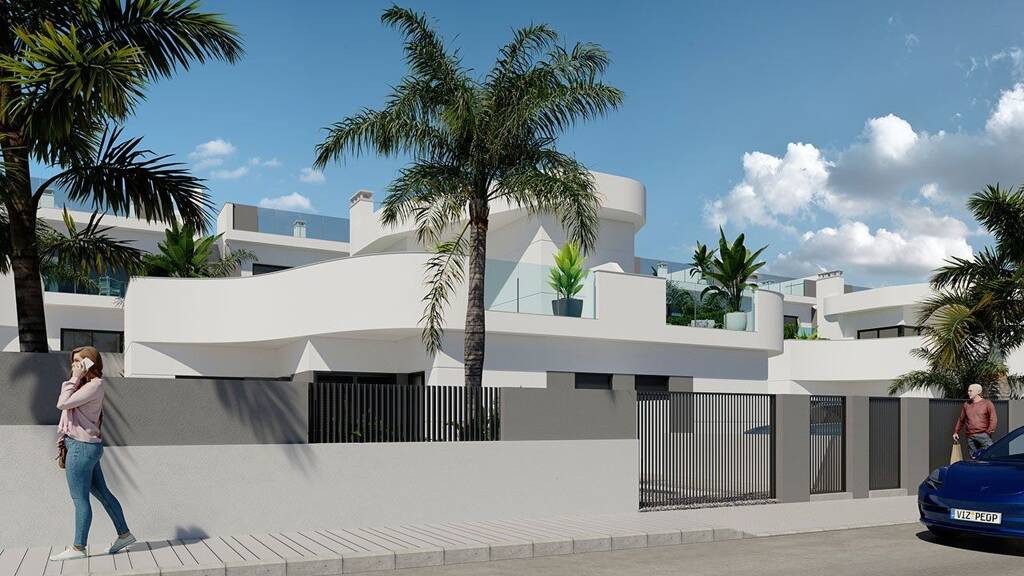 An den Doppelhaushälften fällt zunächst das ausgewogene Gleichgewicht zwischen den geraden, reinen und minimalistischen Linien und den geschwungenen und scheinbar organisch gewachsenen Bauteilen auf. Diese Kombination verleiht den Gebäuden Eleganz und ein raffiniertes Erscheinungsbild, das niemanden gleichgültig lässt. Auf der Terrasse können Sie angenehme Abende mit Ihrer Familie verbringen, Sonnenbäder nehmen oder im Pool Abkühlung finden.