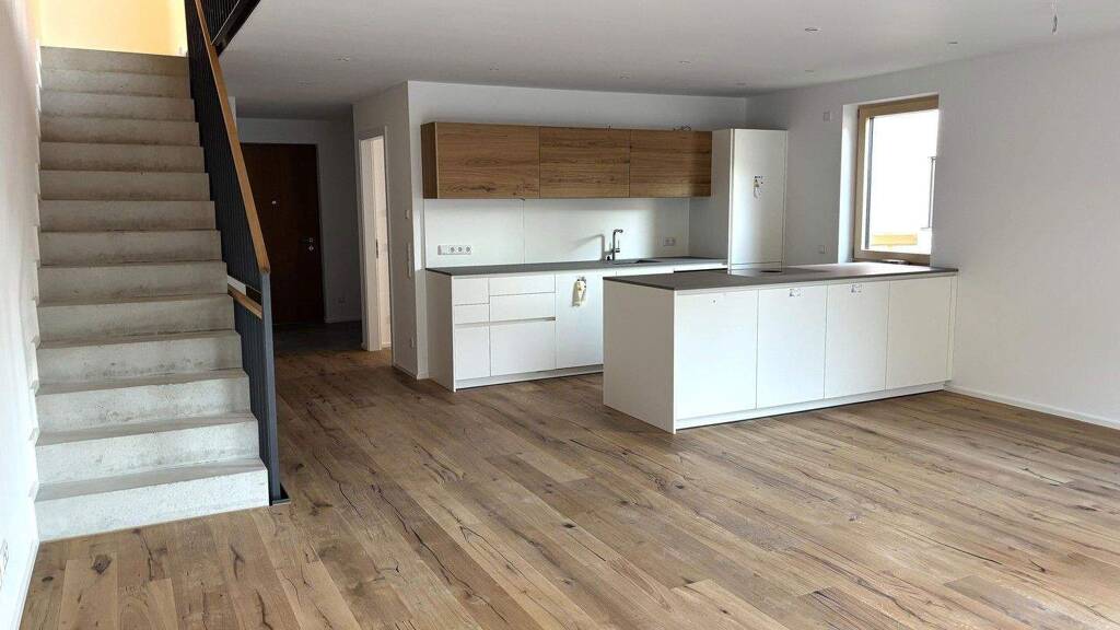 Die Häuser sind vollständig unterkellert und bieten vielfältige Nutzungsmöglichkeiten - von zusätzlichem Stauraum bis zu Hobby- oder Arbeitsbereichen. Im Erdgeschoss erwartet Sie ein offener Wohn- und Essbereich mit direktem Zugang zur Terrasse und zum privaten Garten. Der moderne Sichtestrich in Kombination mit Parkett und der offen gestalteten Sichtbetontreppe verleiht dem Innenraum eine zeitgemäße, einladende Atmosphäre.