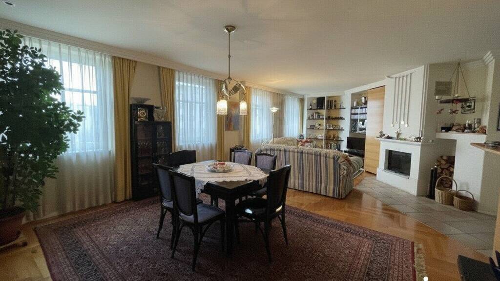 Von der Diele erreicht man den ca. 44 m² großen Wohnsalon mit Essbereich, der das Herzstück der Wohnung bildet. Hier findet das gesellige Familienleben statt. Der offene Kamin macht kalte Winterabende besonders heimelig und gemütlich. Nebenan befindet sich die überaus geräumige Küche mit gemütlichen Essbereich, wo Sie Ihren Tag bereits mit einem ausgiebigen Frühstück beginnen können. Hochwertige Einbaugeräte und viel Arbeitsfläche laden zur Zubereitung Ihrer Lieblingsspeisen ein. Im selben Geschoss befinden sich noch 2 Schlafräume, Schrankraum, ein großes Badezimmer mit Dampfbad, Wirtschaftsraum und 2 WCs.