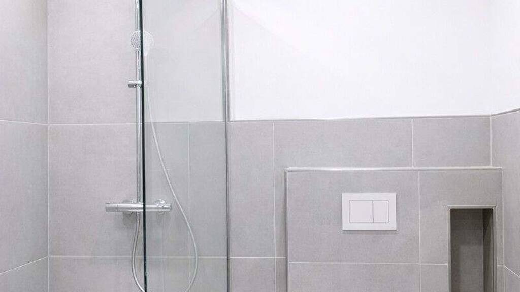 Das moderne Badezimmer ist mit großformatigen Fliesen, einer eleganten Glasdusche sowie hochwertigen Sanitärobjekten ausgestattet und verbindet modernes Design mit dem besonderen Flair der sichtbaren Holzbalken. In allen Wohnräumen wurde hochwertiger Vinylboden verlegt, der für eine warme Optik und angenehmen Wohnkomfort sorgt. Die Wände sind mit feinem Glattputz versehen und unterstreichen den modernen Stil der Wohnung.