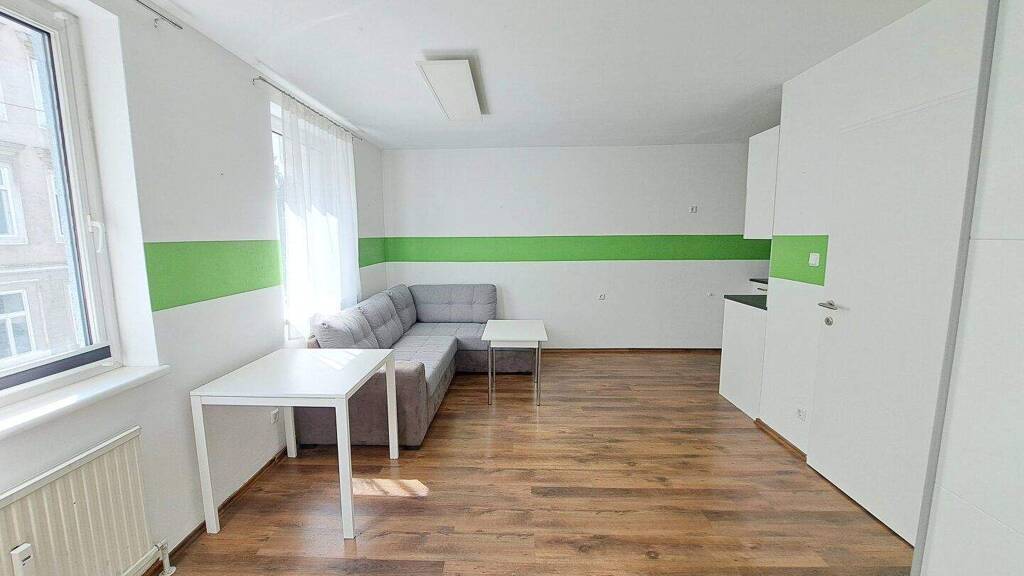 Über den Vorraum gelangt man in das Badezimmer, welches über eine Dusche, Toilette, Waschtisch samt Unterschrank sowie einen großflächigen Spiegel inkl. Beleuchtung verfügt. Das Zimmer von knapp 24 m² bietet genügend Platz, um sich einen gemütlichen Wohn-Essbereich sowie eine kleine Schlafnische einzurichten. Die Küchenzeile beinhaltet eine kleine Herdplatte, Backrohr sowie einen Geschirrspüler. Ein Kühlschrank wäre noch zu ergänzen.