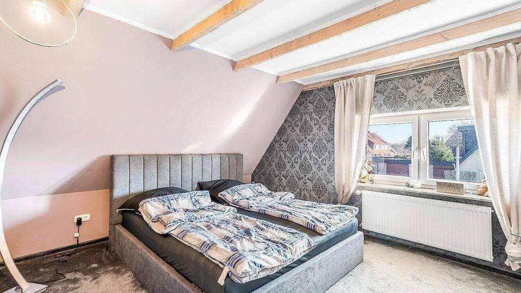 Über eine Treppe mit massiven Holztrittstufen im Flurbereich gelangen Sie in das Dachgeschoss mit offenen Deckenbalken. Hier erwarten Sie ein gemütliches Schlafzimmer mit zwei separaten Ankleideräumen, ein geschmackvolles Wannenbad und ein kleiner Bürobereich am Treppenaufgang. Von hier erreichen Sie über eine Bodentreppe den Dachboden für weitere Verstaumöglichkeiten.