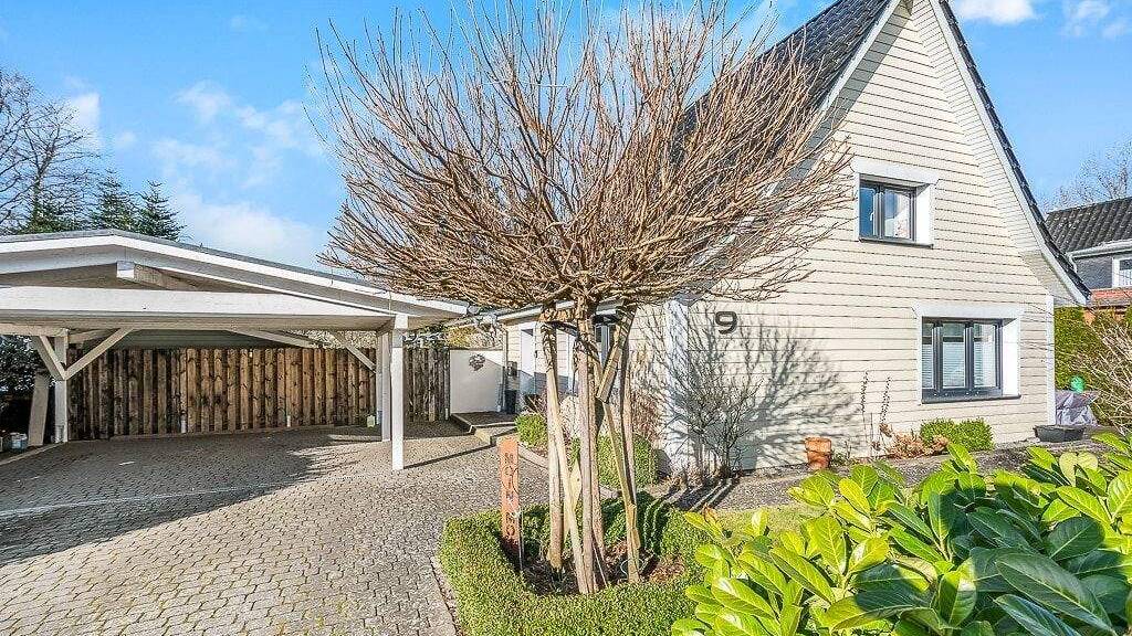Das Einfamilienhaus mit Doppelcarport fällt in der Umgebung durch die besondere Kombination der Dacheindeckung und der Hausverkleidung auf. Das Dach ist mit schwarz glasierten Tondachziegel eingedeckt, die Hauswände sind in der Farbe beige mit Cedral in Holzoptik verkleidet und die Fenster haben weiße Umrahmungen erhalten.