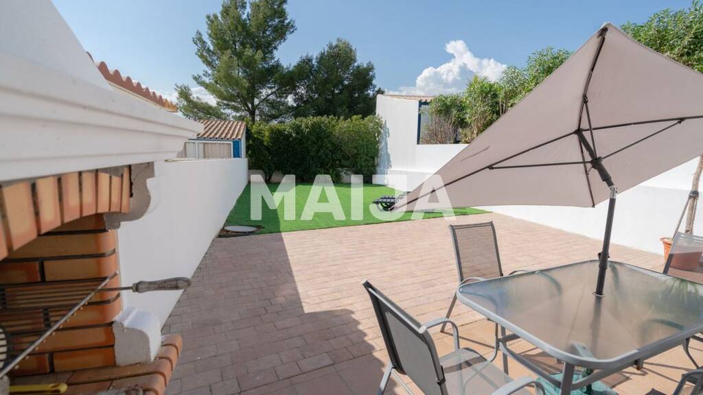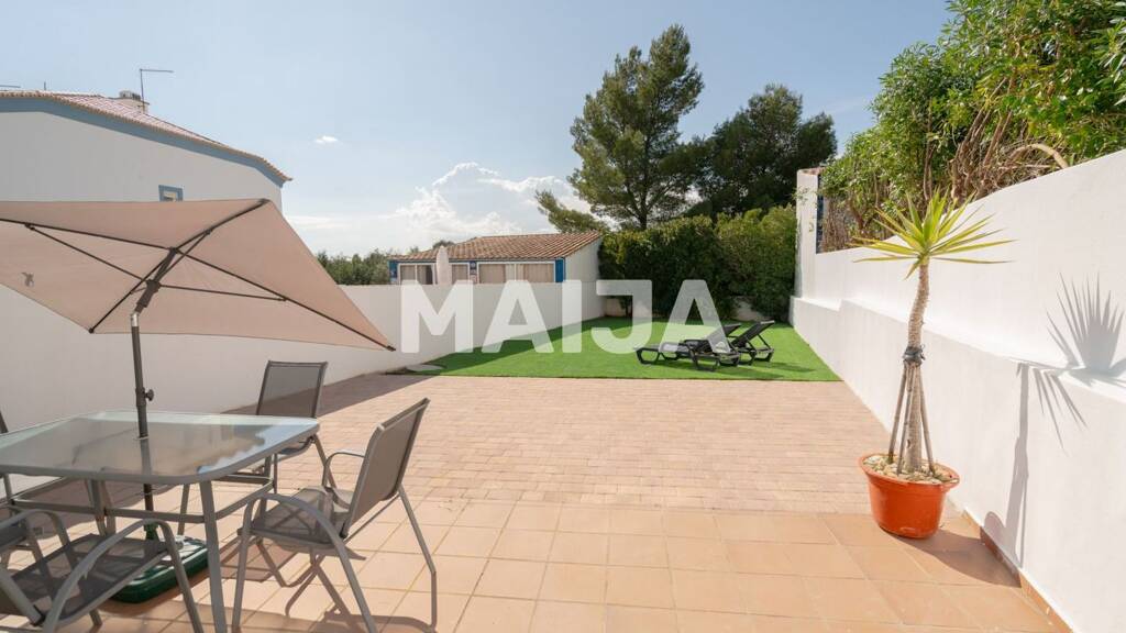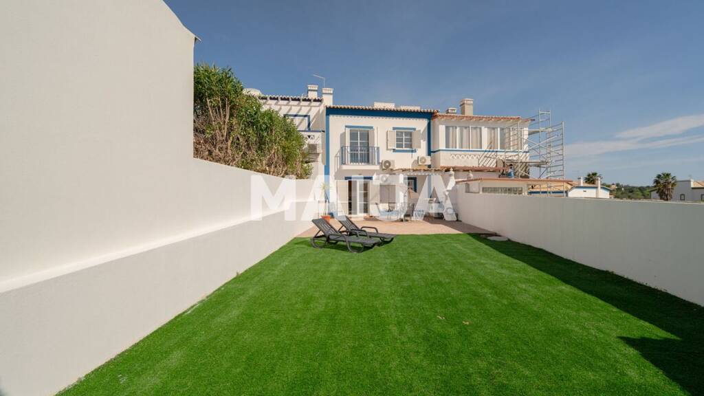 Dieses bezaubernde, typisch portugiesische Reihenhaus in gutem Zustand, blau und weiß gestrichen, hat große, helle und geräumige Räume und einen großen, sonnigen Garten. Das Haus erstreckt sich über 2 Stockwerke. Das Erdgeschoss hat traditionelle Fliesenböden, während die Schlafzimmer im ersten Stock Laminatböden haben. Es gibt überall eine Klimaanlage. Das Erdgeschoss besteht aus einem offenen Wohn- und Essbereich mit einem Holzkamin und Zugang zur vorderen Terrasse, einer großen, voll ausgestatteten Küche, einem Gäste-WC und einem Stauraum unter der schönen Holztreppe. Der erste Stock hat eine Master-Suite mit ebenerdiger Dusche, Einbauschränken und einem Ostbalkon, um die Morgensonne zu genießen. Die anderen 2 Zimmer sind nach Westen ausgerichtet. Das Zweibettzimmer hat einen kleinen französischen Balkon und Einbauschränke. Das dritte Schlafzimmer wurde zuvor als Büro genutzt. Auf dieser Etage befindet sich auch ein Familienbad mit Badewanne und Bidet. Auf der Rückseite des Grundstücks, von der Küche aus, befindet sich ein großer, gut gepflegter, ummauerter Garten mit einem Terrassenbereich mit eingebautem Backsteingrill und einer schönen, üppigen grünen Wiese. Aufgrund der Länge des Gartens gibt es den ganzen Tag über eine hervorragende Sonneneinstrahlung.