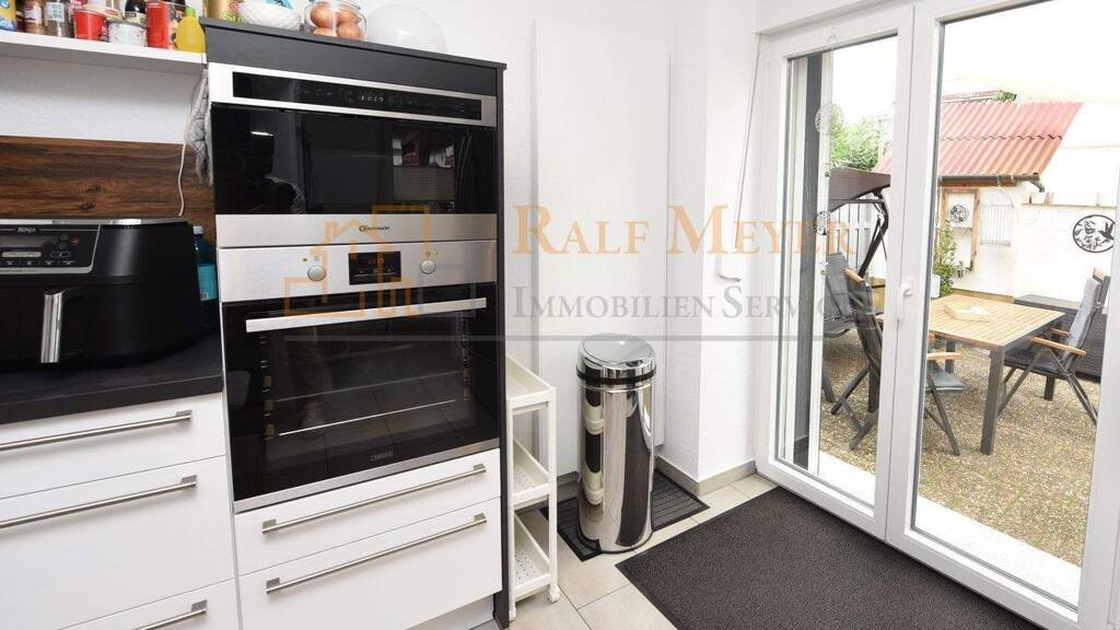 Das helle Erdgeschoss verfügt über ein großzügiges Schlafzimmer, ein gemütliches Wohn-Esszimmer mit Kaminofen, ein Duschbad sowie eine Wohn-Küche mit neuer, hochwertiger Einbauküche. Von der Küche aus gelangt man direkt in den gemütlichen Innenhof mit attraktiver Outdoorküche.