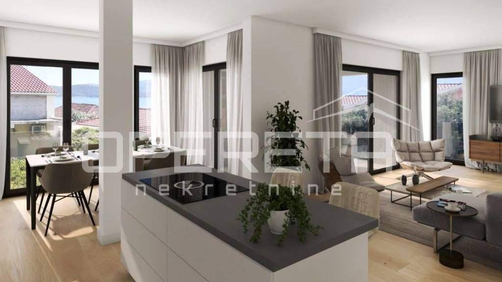 Zum Verkauf steht eine geräumige und modern eingerichtete Wohnung im Erdgeschoss eines Neubaus in Orebic mit einer Gesamtfläche von 99 m. Die Immobilie besteht aus zwei Schlafzimmern, zwei elegant ausgestatteten Badezimmern, zwei Loggien und einer großen offenen Terrasse, und zur Wohnung gehört auch ein privater Garten mit einer Fläche von 55 m.