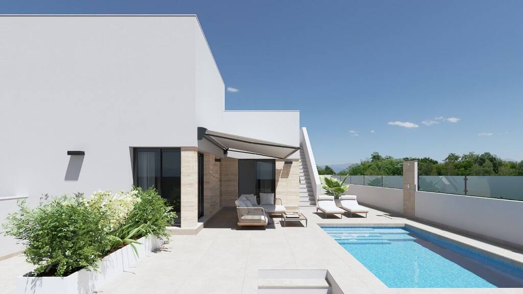 Die Villen befinden sich alle auf einer Ebene und die Innenausstattung besteht aus einem geräumigen, offenen Wohn- und Essbereich mit Terrassentüren zur Terrasse, einer voll ausgestatteten amerikanischen Küche, einer separaten Waschküche, einem Hauptschlafzimmer mit eigenem Bad und begehbarem Kleiderschrank / Ankleidebereich, einem weiteren Doppelschlafzimmer und einem separaten Gästebad. Eine Außentreppe an der Seite des Anwesens führt hinauf zur großen Dachterrasse, auf der man den ganzen Tag die Sonne genießen kann. Die Immobilien verfügen über eine Vorinstallation für eine Klimaanlage, Einbauschränke in allen Schlafzimmern, LED-Innenbeleuchtung, einen privaten Swimmingpool, eine Außendusche und einen privaten Parkplatz auf dem Grundstück.