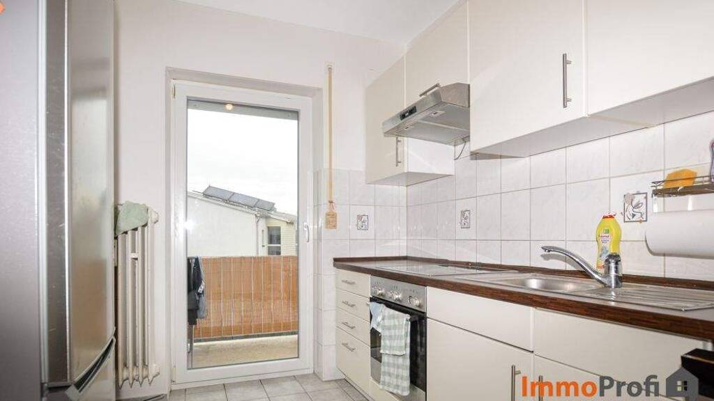 Die separate Küche verfügt über eine weiße Einbauküche mit Elektrogeräten und bietet ausreichend Stauraum sowie Arbeitsfläche. Von hier aus gelangt man auf den ruhig gelegenen, nach hinten ausgerichteten Balkon, der zu entspannten Stunden im Freien einlädt.