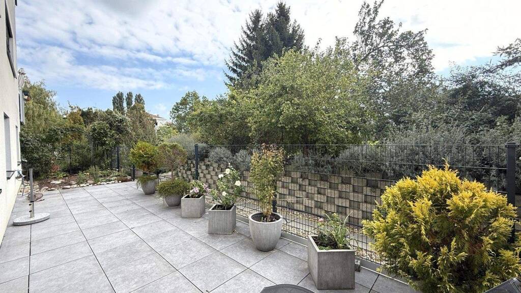 The exit to the private garden is from the living/dining kitchen onto a large garden terrace, at the end of which a small but lovely green garden square has been added. On the other side of the fence, more beautiful plants and trees catch the eye and warm the heart, an idyll for nature lovers and relaxation for the soul.