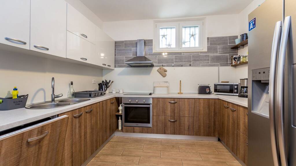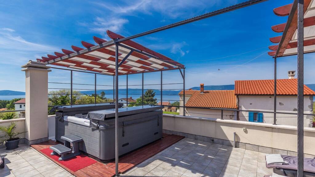 In ruhiger Lage nahe der Stadt Krk befindet sich dieses charmante Reihenhaus aus Stein - ideal zum Entspannen und Genießen des mediterranen Lebensstils. Die Kombination aus traditioneller Architektur und modernen Annehmlichkeiten bietet die perfekte Mischung aus Authentizität und Luxus. Das Haus erstreckt sich über drei Etagen - Erdgeschoss, Obergeschoss und eine großzügige Dachterrasse. Das Erdgeschoss verfügt über ein gemütliches Wohnzimmer mit Küche und Essbereich, ein zusätzliches WC, einen Abstellraum, eine Taverne und einen speziell eingerichteten Aufenthaltsraum. Im Obergeschoss befinden sich vier elegante Schlafzimmer, jedes mit eigenem Bad, Ankleidezimmer, zusätzlichem WC und einer Terrasse mit beheiztem Pool. Eine Außentreppe führt zu einer spektakulären 22 m² großen Dachterrasse mit Whirlpool und unvergesslichem Panoramablick, insbesondere auf die Insel Cres. Das Haus wird komplett möbliert und für maximalen Komfort ausgestattet verkauft. Der Garten bietet ausreichend Stellplätze für mehrere Fahrzeuge, und die gesamte Umgebung bietet die nötige Ruhe und Privatsphäre für einen erholsamen Urlaub. Wenn Sie eine einzigartige Immobilie auf Krk suchen, die Luxus, Aussicht und authentischen Charme vereint, ist dieses Haus eine seltene Wahl.