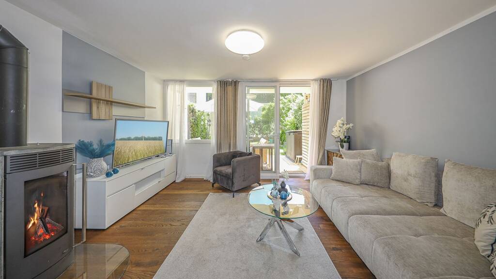Im Erdgeschoss betritt man die Wohnung und gelangt sodann in die Diele/Garderobe, weiters in den Wohnraum mit Kamin und offener Küche, ausgestattet mit allen Geräten. Vom Wohnraum gelangt man auf die Richtung Süden ausgerichtete Terrasse und sodann in den Garten. Auf dieser Etage befindet sich noch ein Badezimmer mit Dusche und WC.