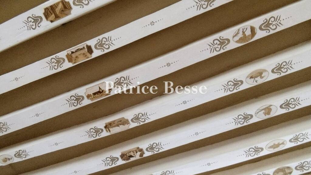 To the left, there is also a dual aspect dining room, which boasts wood stripped flooring. An imposing stone fireplace includes a relieving arch on the overmantel. During the recent restoration work, remains of old frescoes were preserved and restored, especially an impressive trompe-l'oeil architectural backd-rop framing one of the doors.