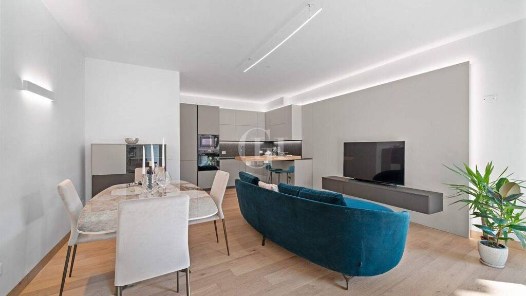 Der Wohnbereich besteht aus einem hellen Wohnzimmer mit offener Küche, die auf eine private Terrasse führt, die sich perfekt für Momente der Entspannung oder Geselligkeit im Freien eignet. Der Schlafbereich wurde mit besonderem Augenmerk auf den Komfort gestaltet: Sowohl das Hauptschlafzimmer als auch das zweite Schlafzimmer verfügen über begehbare Kleiderschränke nach Maß, die Ausdruck eines maßgeschneiderten Designs mit Liebe zum Detail sind.